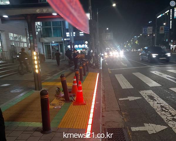▲ 사진=동작구 노량진역 앞 LED바닥신호등 모습. 동작구는 올해 관내 어린이보호구역 내 모든 횡단보도에 LED바닥신호등을 설치할 계획이다.동작구(구청장 박일하)는 올해 안전한 보행환경을 조성하기 위해 관내 어린이보호구역 내 모든 횡단보도에 LED바닥신호등을 설치할 계획이다.