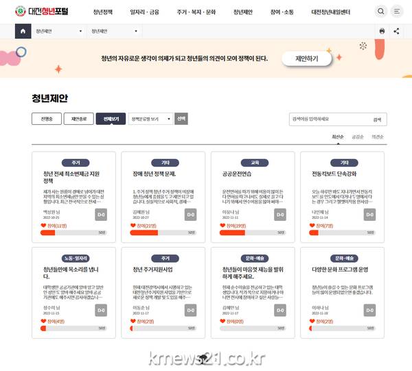 대전청년포털(https://www.daejeonyouthportal.kr)’에 마련한“청년제안”은 지난해 10월 구축한 뒤 12월까지 약 3개월간 시범운영을 거쳐 정식 운영을 개시하게 되었다.