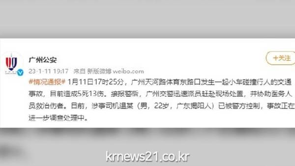 광저우 공안국에 따르면 현지 시각 11일 오후 5시 25분 광저우 도심 톈허구의 한 교차로에서 검은색 BMW 차량이 행인들을 덮쳐 5명이 숨지고 13명이 다쳤다.
