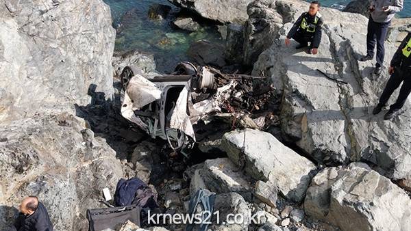 오늘 오전 10시 50분쯤 경남 거제시 남부면 다포리의 비포장 도로 옆 여차전망대에서 승용차가 150미터 아래로 떨어졌다.