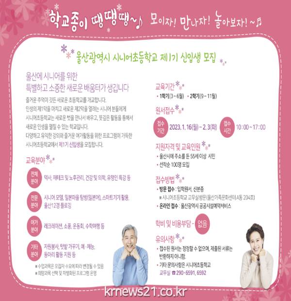 울산시 관계자는 “올해 3월 개교하는 ‘울산 시니어초등학교’를 통해 베이비부머 퇴직자 등 시니어들의 다양한 교육수요에 충족하고 새로운 삶의 원동력이 될 양질의 교육을 제공하겠다.”며 “55세 이상의 울산시민이라면 누구나 무료로 입학할 수 있으니 많은 관심과 참여를 당부드린다.”라고 밝혔다.