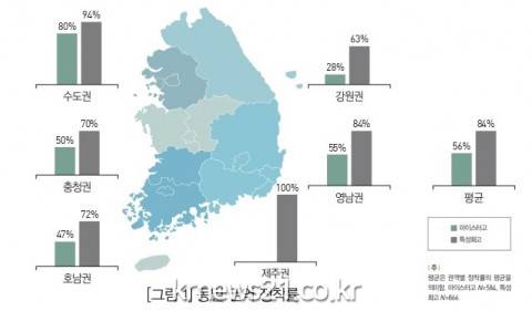 마이스터고 졸업생의 동일 권역 정착률이 평균(6대 광역권역별 정착률의 산술 평균을 의미) 56%인 것에 반해 특성화고는 84%로 이보다 훨씬 높았다.