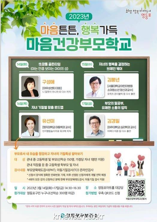 ▲ 사진=제3회 마음건강부모학교 홍보포스터영등포구(구청장 최호권)가 3월 14일부터 17일까지 영등포아트홀에서 ‘제3회 마음건강부모학교’를 총 4회 운영한다고 밝혔다.