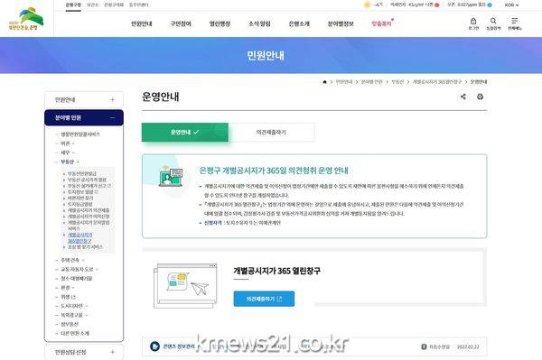 ▲ 은평구, ‘개별공시지가 365 열린 창구’ 개설해서울 은평구(구청장 김미경)는 개별공시지가에 대한 의견을 상시 제출할 수 있는 ‘365 열린 창구’를 개설해 운영한다.