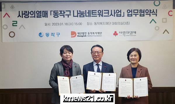 ▲ 사진=이은영 동작구청 복지국장(왼쪽)과 황동혁 동작복지재단이사장, 신혜영 서울사회복지공동모금회 사무처장이 지난 18일 동작복지재단에서 지역성장 프로젝트 ‘나눔네트워크’ 사업 업무협약을 체결하고 기념 촬영을 하고 있다.동작구(구청장 박일하)는 지난 18일 동작복지재단, 서울사회복지공동모금회와 지역성장 프로젝트 ‘나눔네트워크’ 사업을 위한 협약(MOU)을 체결했다.
