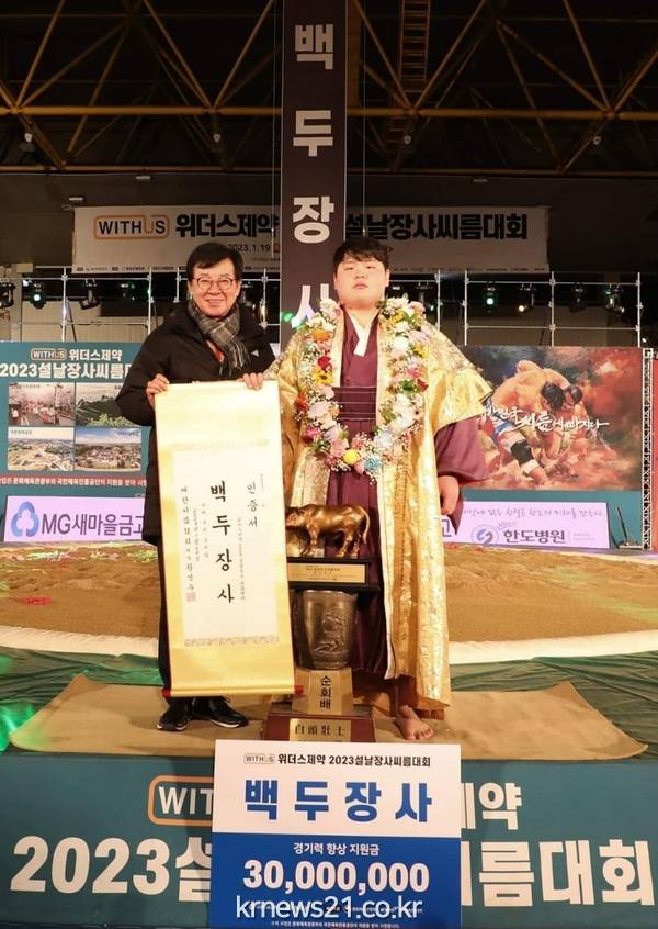 장흥군 회진면 출신 김민재(영암민속씨름단)가 지난 1월 24일 영암실내체육관에서 개최된 ‘위더스제약 2023 설날장사씨름대회’ 백두장사(140㎏ 이하)에 올랐다.
