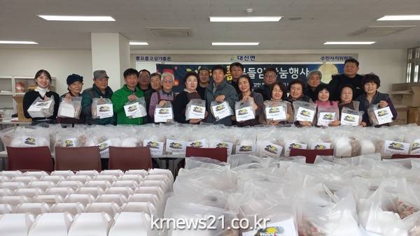 지난 1월 30일 대신면주민자치위원회(위원장 박건배)는 2023년 새해 정월대보름(음력 1월 15일)을 맞아 ‘정월대보름 맞이 나눔행사’를 진행하였다. 이날 행사에는 대신면 주민자치위원 및 봉사자 30명이 참여하여 견과류가 들어간 고소한 빵 1,000여 개를 주민자치센터에서 직접 구웠고, 땅콩과 함께 대신면에 나눔의 손길이 필요한 약 250가구에 전달하였다.