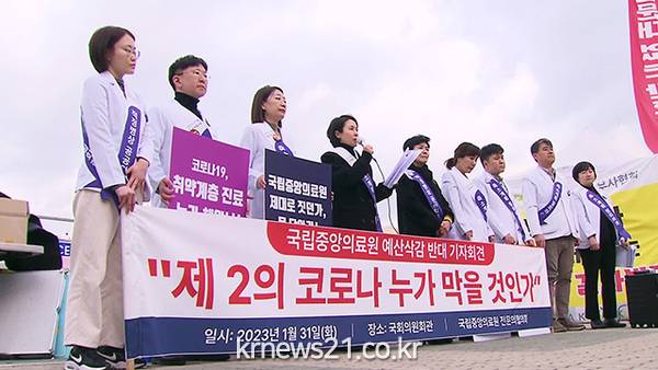 ▲ 사진=KBS NEWS국립중앙의료원 소속 전문의들이 정부의 국립중앙의료원 신축·이전 예산 삭감을 규탄했다.