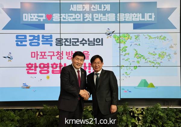 박강수 마포구청장이 2일 오전, 자매결연 협의 및 기관 간의 우호교류를 위해 마포구를 방문한 문경복 옹진군수와 간담회를 가졌다.