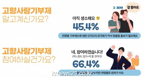 또 고향사랑기부제 활성화를 위한 개선방안(복수 응답)으로는 △기부금 내역 및 활용의 투명한 공개(68.4%) △지역 현안문제 적극 활용(54.3%) △양질의 답례품 제공(44.8%) 등을 가장 많이 언급했다.
