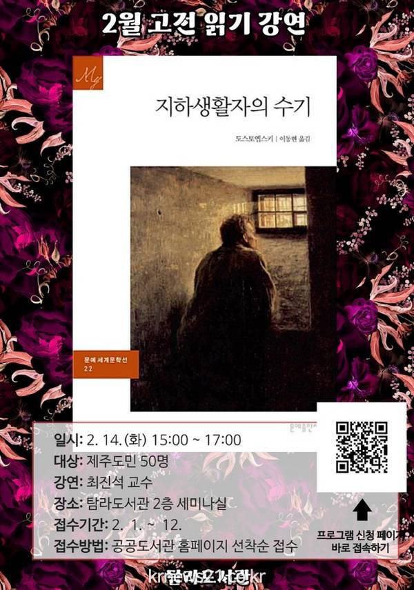 ▲ 사진=제주시탐라도서관은 2월 14일 화요일 오후 3시에 탐라도서관 세미나실에서 <도스토옙스키의『지하생활자의 수기』최진석 작가 강연>을 운영한다고 밝혔다.