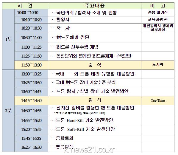 토의 안건은 ▲對드론체계 진단 ▲통합방위와 연계한 對방드론체계 구축방안 ▲국내외 드론 테러 유형별 대응방안 ▲국내 對드론장비 기술수준 분석 ▲드론 발전방안 등이며, 1부와 2부로 나뉘어 진행될 예정이다.