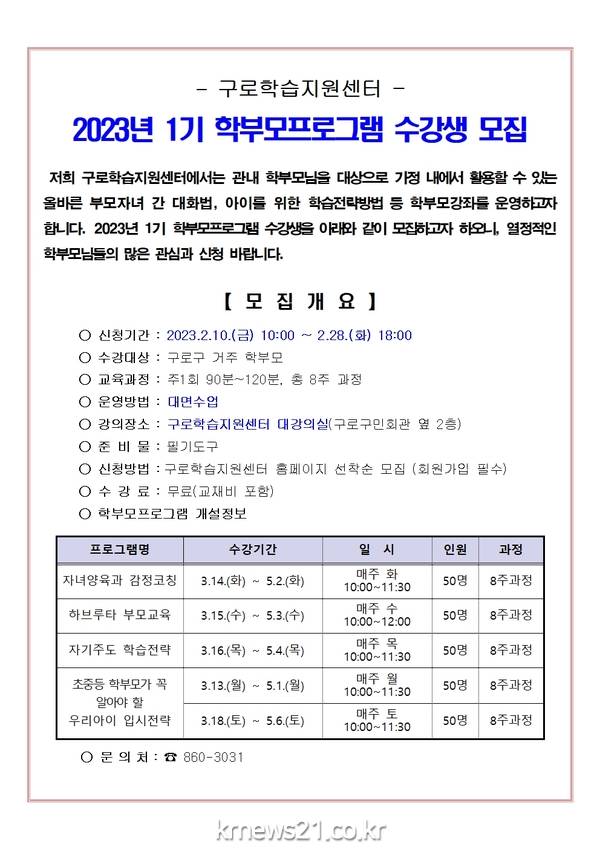구로구가 구로학습지원센터 학부모프로그램을 3년 만에 대면 수업으로 전환해 수강생을 모집한다.