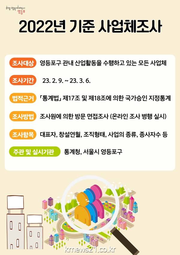 영등포구(구청장 최호권)가 2월 9일부터 3월 6일까지 ‘2022년 기준 사업체조사’를 실시한다고 밝혔다.