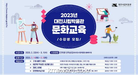 대전시립박물관은 시민들에게 다양한 문화·예술 기회를 제공하기 위한‘2023년 문화교육 프로그램’수강생을 모집한다고 밝혔다.