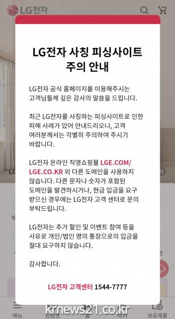 LG전자는 우선 자사 홈페이지에 접속한 고객들에게 온라인 사기 피해에 대한 경고 ‘팝업 창’을 게시했다. 팝업 창에는 온라인 사기 수법에 대한 주의와 함께 위장사이트나 현금 입금을 유도하는 사례 발견 시 제보해 달라는 메시지를 담았다.