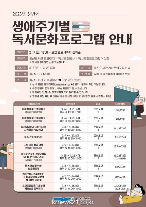 울산도서관은 오는 3월 7일부터 4월 28일까지 ‘2023년 상반기 생애주기별 독서문화 프로그램’을 운영한다고 밝혔다.