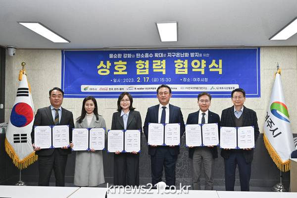 ▲ 여주시, “물순환 강화와 탄소흡수 확대로 숲가꾸기 상호 협력 협약” 개최2월 17일(금) 여주시(시장 이충우)는 숲가꾸기를 통해 기후변화 위기에 대응하기 위해 한국코카-콜라, WWF-Korea(세계자연기금), 한국수자원공사 한강유역본부, 한국생태환경연구소, 여주시산림조합과 “물순환 강화와 탄소흡수 확대로 지구온난화 방지를 위한 상호 협력 협약서” 업무협약식을 체결했다.