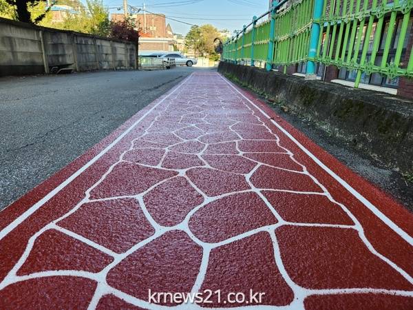 ▲ 사진=용인특례시가 어린이 보행안전을 위해 처인구 양지초 후문에 도막형바닥재를 설치했다용인특례시(시장 이상일)는 어린이 통학 안전을 위해 처인구 원삼면 두창초교 등 어린이 보호구역 10곳에 도막형 바닥재(미끄럼 방지와 색깔구분 가능한 바닥재) 등 안전시설물을 설치한다고 20일 밝혔다.