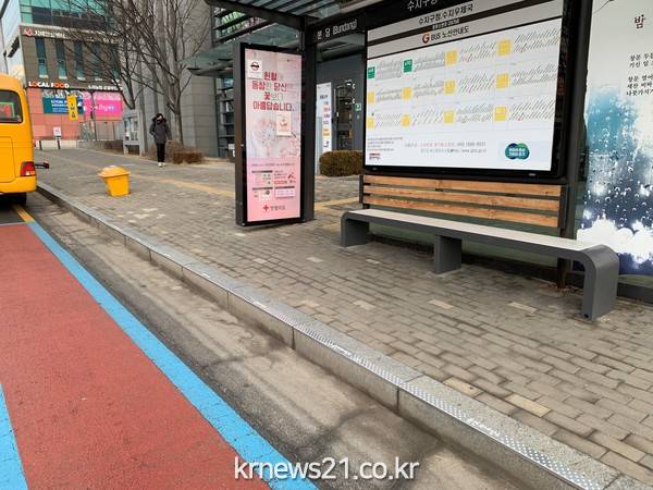 ▲ 사진=수지구가 버스정류소 보행안전을 위해 미끄럼 방지판을 설치했다 용인특례시 수지구는 시민들이 버스를 이용할 때 미끄럼 사고를 예방하기 위해 수지구청 앞 등 관내 30곳의 버스정류소 경계석에 미끄럼 방지판을 설치했다고 20일 밝혔다.