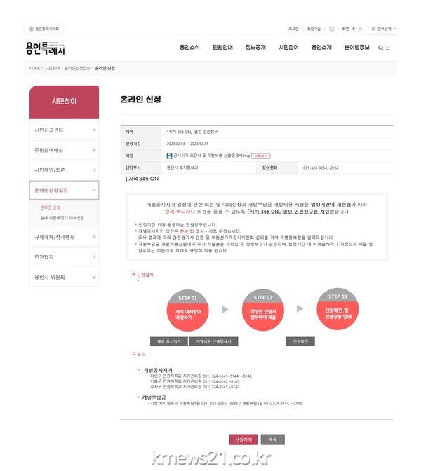 ▲ 사진=용인시 홈페이지에 구축한 지적 관련 민원 창구 `지적365ON` 용인특레시가 민원인들의 편의를 위해 개별공시지가 의견제출 등의 지적 민원에 대해 법적으로 정해진 기간이 지나도 민원을 접수할 수 있는 서비스를 운영한다.
