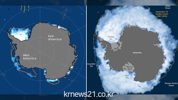 CNN방송에 따르면 미국 국립설빙데이터센터(NSIDC)는 현지 시각 21일 남극 대륙을 둘러싼 해빙 면적이 13일 기준 191만㎢로 1978년 시작된 위성 관측 사상 최소 면적을 기록했다고 밝혔다.