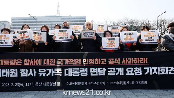 10·29 이태원 참사 유가족협의회는 오늘(23일) 오전 용산 대통령 집무실 앞에서 기자회견을 열고 대통령의 공식 사과와 독립조사기구 설치를 위한 특별법 제정을 촉구했다.