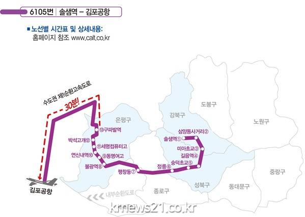 ▲ 은평구, 김포공항행 공항버스 6105번 정류소 신설 운행서울 은평구(구청장 김미경)는 김포공항을 오가는 ‘공항버스 6105번’ 정류소 11곳 신설해 다음달 1일부터 운행한다.