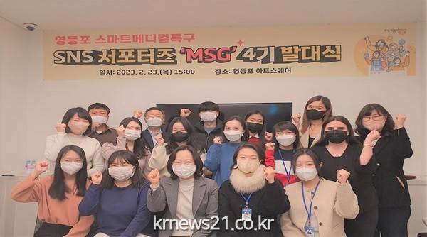 ▲ 영등포구,‘SNS 서포터즈 MSG 4기’ 출범영등포구(구청장 최호권)가 지난 23일 영등포 아트스퀘어에서 스마트메디컬특구 ‘SNS 서포터즈 MSG 4기’ 발대식을 갖고 본격적인 활동에 나선다고 밝혔다.