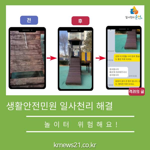순천시(시장 노관규)는 대한민국 국민 대다수가 사용하는 스마트폰 소통 앱인 카카오톡 채널을 통해 생활민원을 접수 ․ 처리하는‘일사천리 순천’이 개설 이후 신속한 업무처리로 시민에게 큰 호응을 얻고 있다고 밝혔다.
