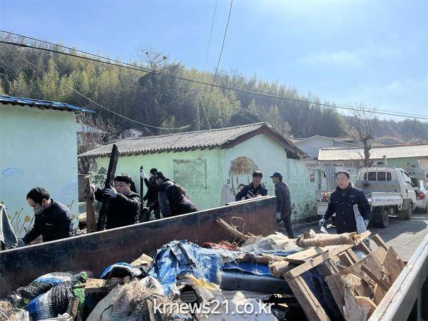 ㈜진진개발, ㈜일등 등 전문 업체에서 무상으로 장비와 인력을 지원하여, 용산면사무소 직원 및 주민 등 20여 명의 봉사자들이 함께 건물 잔해 철거와 다량의 폐기물 처리를 도왔다.