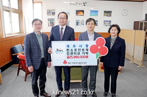 ▲ 사진=제주시제주시는 2020년도 탄소포인트제 인센티브(상품권) 미지급분 2,599만 원을 제주특별자치도 사회복지공동모금회(회장 강지언)에 지정 기탁했다.