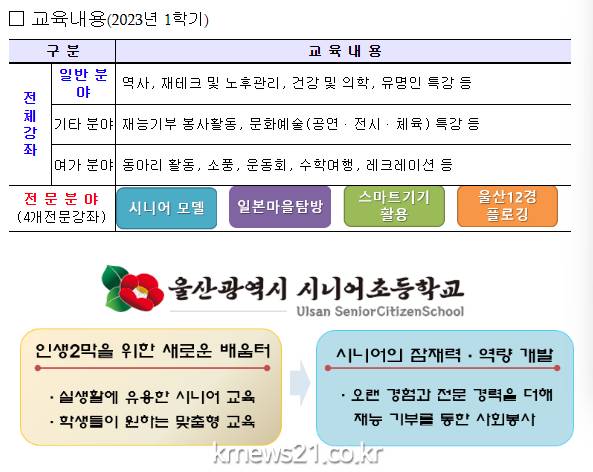 한편 민선 8기 시장 공약인 ‘울산 시니어초등학교’는 베이비부머 퇴직자 및 노년층을 대상으로 다양하고 유익한 교육프로그램을 제공하는 신노년 특화 교육기관이다.