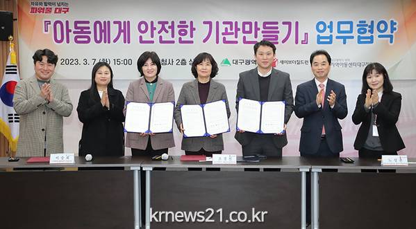 대구시는 3월 7일(화) 오후 3시 동인청사 2층 상황실에서 세이브더칠드런 동부지역본부, 지역아동센터대구지원단과 함께 ‘아동에게 안전한 기관 만들기’ 사업 추진을 위한 업무협약을 체결했다.