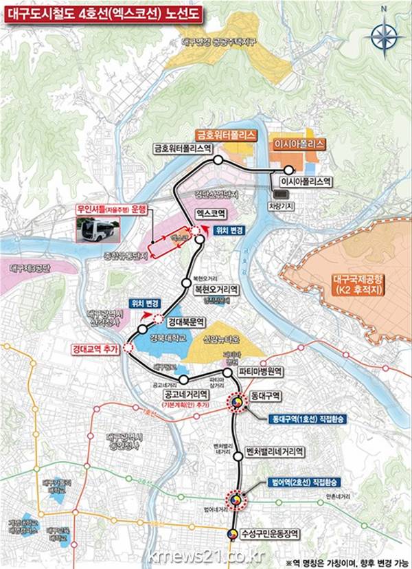 우선, 해당 노선의 명칭을 엑스코선에서 도시철도 4호선으로 바꿔 부르기로 한다. ‘엑스코선’이라는 명칭은 사업추진 과정에서 임시로 붙여진 이름(가칭)으로, 국토부의 사업 승인·고시 단계를 앞두고 그동안 도시철도 건설 순서에 따라 1, 2, 3호선으로 호칭했으므로 ‘도시철도 4호선’으로 공식 명칭을 통일하고자 한다.