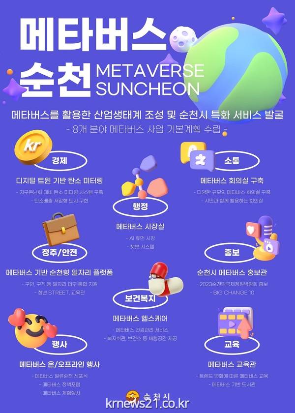 순천시 디지털정책과 관계자는 “앞으로 경제, 교육, 노동, 보건복지, 정주환경 등 시정의 다양한 분야에 메타버스 기반 행정을 펼쳐 메타버스 행정 분야에서도 대한민국의 표준을 만들어 나가겠다”고 말했다.