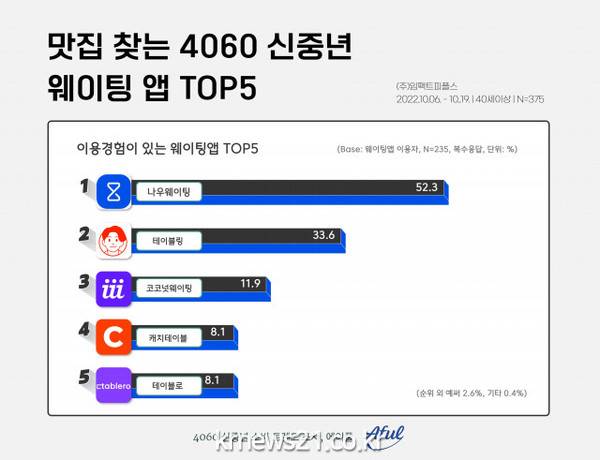 4060 신중년 ‘이용 경험이 있는 웨이팅 앱(복수 응답)’ 1위는 나우웨이팅(52.3%)이 차지했다. 나우웨이팅은 동일 조사 항목 중 ‘이용 경험이 있는 웨이팅 앱 중 가장 만족도가 높은 앱(48.1%)’으로 지목되기도 했다.