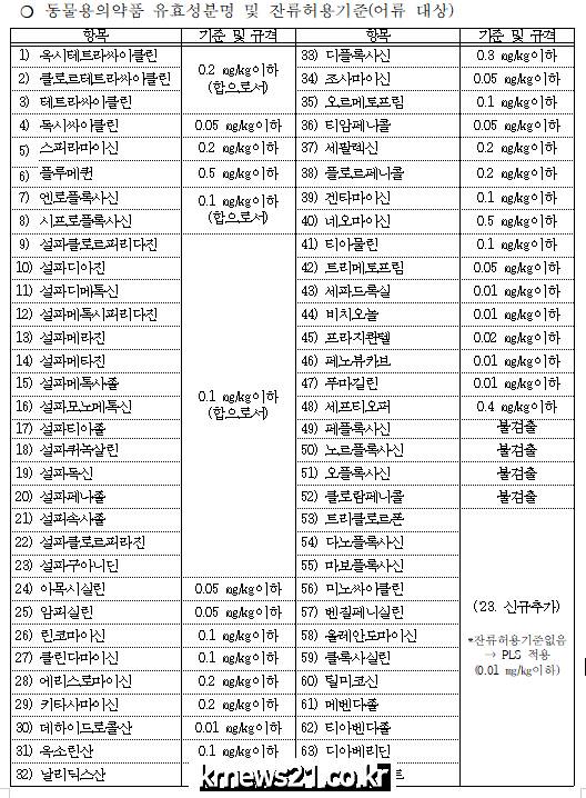 *검사항목: 아목시실린, 암피실린, 옥시테트라사이클린 등 항생제로써 「식품의 동물용의약품 잔류허용 기준」에 따라 잔류기준 초과 검출 여부 검사