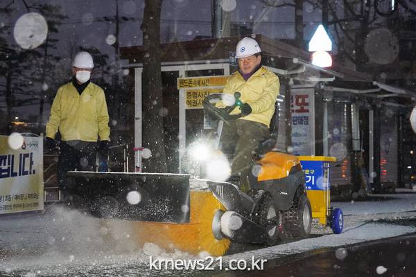 ▲ 사진=보도용 제설 장비로 보도 제설 중인 이필형 동대문구청장 동대문구(구청장 이필형)가 금년도 강설 시 신속하고 스마트한 제설작업으로 구민불편을 최소화하고 낙상사고 없는 안전한 겨울나기에 성공했다고 밝혔다.