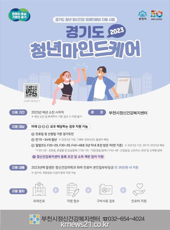 부천시(시장 조용익)와 부천시정신건강복지센터(센터장 김신겸)는 청년정신건강증진을 위해 청년 정신건강 외래치료비를 지원하는 ‘청년마인드케어’ 사업을 실시한다.
