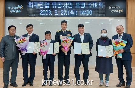 이날 표창을 수상한 강신학 상인회장 및 유준식, 김수영, 정필태 상인회원은 지난 17일 6시 40분경 평소처럼 일찍 출근해 시장 순찰을 하던 중 박황순 중앙시장 연합회장으로부터 화재 상황을 유선 연락받고 해당 점포에 도착하여 주변에 비치되어 있던 소화기를 이용해 화재를 초기에 진화하여 화재 확산을 방지하는데 크게 기여했다.