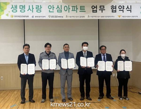 구는 지난 24일 강서구정신건강복지센터, 서울주택공사(SH) 강서주거안심종합센터, 강서경찰서 공항지구대, 방화2동주민센터, 방화11종합사회복지관, 방화11단지관리사무소 등 6개 유관기관이 함께하는 업무 협약을 체결하였다.