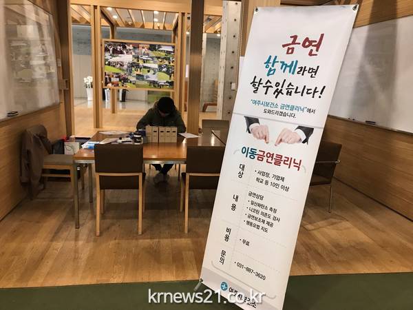▲ 여주시보건소, 굿바이 니코틴! 이동금연클리닉 실시여주시보건소는 4월 3일부터 8월 31일까지 보건소에 방문하기 힘든 시민들의 생활터 중심 금연서비스를 제공하기 위해 사업장, 대학교, 군부대 등으로 찾아가는 이동금연클리닉을 실시한다.