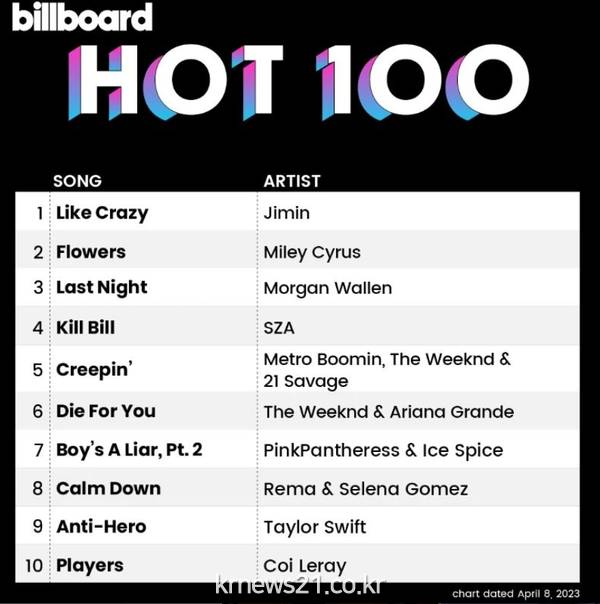 이에 따르면 지민은 팝스타 마일리 사이러스의 '플라워스'(Flowers), 선풍적인 인기를 끌고 있는 컨트리 가수 모건 월렌의 '라스트 나이트'(Last Night), 시자(SZA)의 '킬 빌'(Kill Bill) 등 쟁쟁한 노래를 제치고 정상에 올랐다.