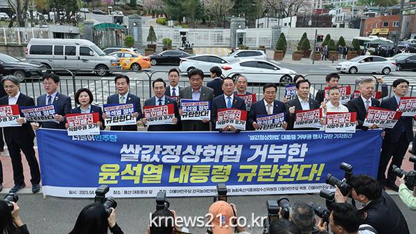 반면 더불어민주당 박홍근 원내대표와 농해수위 위원들, 전국농어민위원회 소속 의원들은 이날 용산 대통령실 앞에서 기자회견을 열고 "'쌀값 정상화법'을 거부하고 국민의 뜻을 무시한 윤 대통령을 강력히 규탄한다"고 밝혔다.