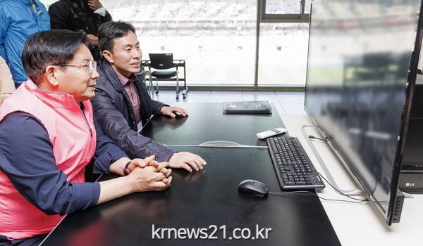 ▲ 사진=CCTV로 안전관리 상황을 살피는 박강수 마포구청장(앞)과 임성순 마포경찰서장마포구(구청장 박강수)가 지난 8일, 마포경찰서(서장 임성순)와 함께 서울월드컵경기장 일대에 대한 특별 안전관리 대책을 실시했다. 이는 2023 하나원큐 K리그에 많은 인파가 몰릴 것에 대비한 긴급대책이다.