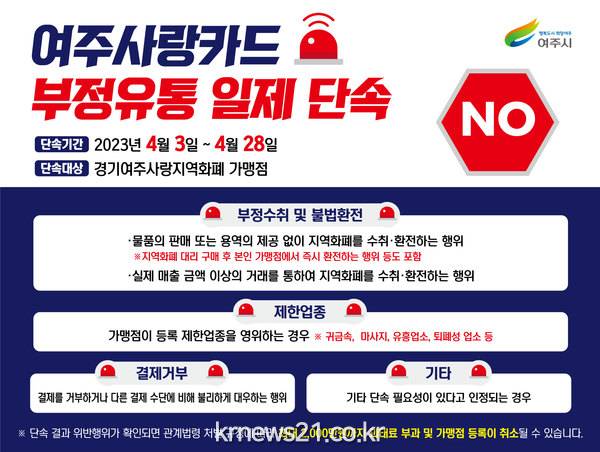 ▲ 여주시, 여주사랑카드 부정유통 일제단속 실시여주시(시장 이충우)는 지역화폐인 여주사랑카드의 부정유통 근절을 위해 오는 4월 3일부터 28일까지 합동단속에 나선다고 밝혔다.
