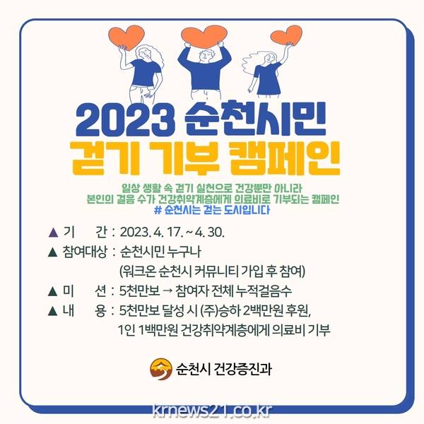 순천시(시장 노관규)가 시민의 건강한 걸음이 건강 취약계층에게 기부금으로 전달되는 ‘시민 걷기 기부 캠페인’을 개최해 시민의 건강과 나눔문화를 동시에 챙긴다고 밝혔다.