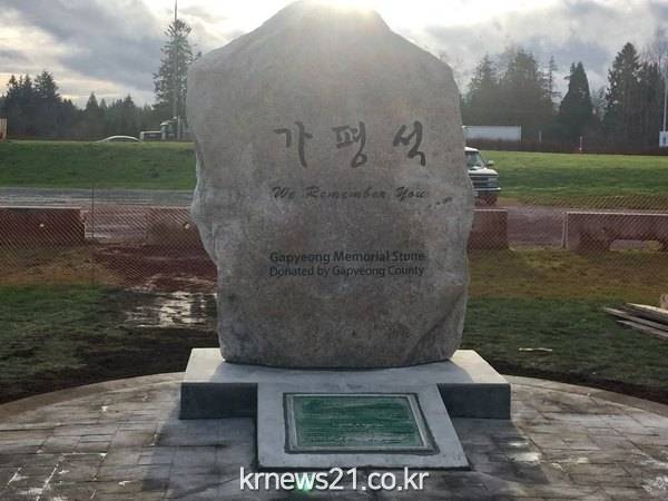 ▲ 사진=2019년 캐나다 랭리타운쉽에 제작설치된 가평석“저는 이렇게 걸음으로서 72년전 가평계곡에서 이십대의 젊은 나이에 전사한 우리 선조들을 추모하고 한국-캐나다 수교 60주년을 맞아 양 국가의 혈맹관계를 더 끈끈하게 유지하기를 기원하며 걷기를 계속 할 것입니다.”