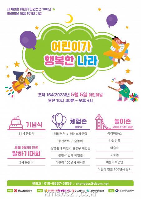 행사는 당일 10시 30분에 개장해 오후 4시까지 진행하며, 체험존과 놀이존에서는 캐리커처, 페이스페인팅, 풍선아트, 버블아트공연, 숲놀이, 방정환 어린이 길동무체험관, 봉황각 만세 체험관, 어린이 100년사 전시회, 대형에어바운스, 마술쇼, 어린이인권 100년사 전시 등을 운영한다.